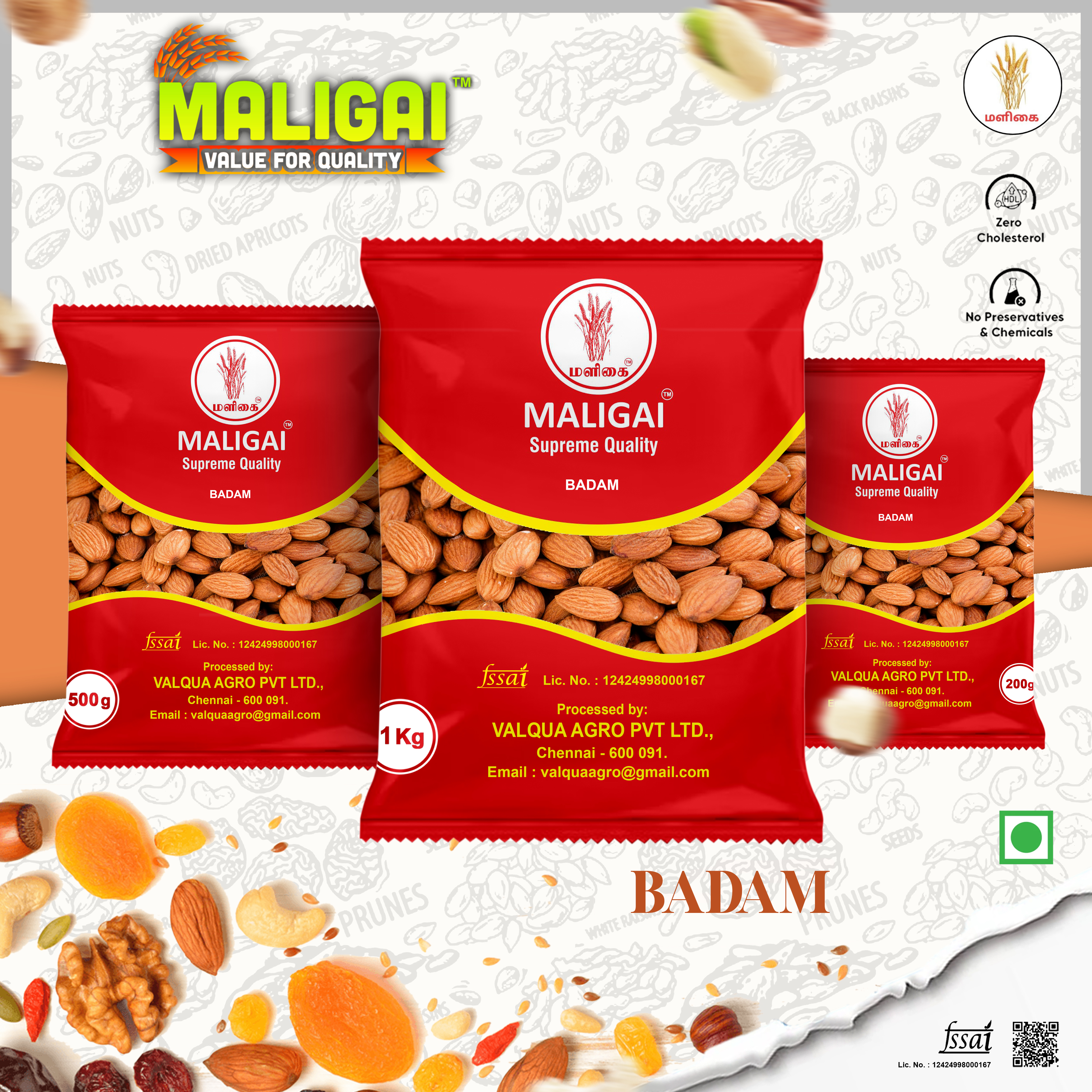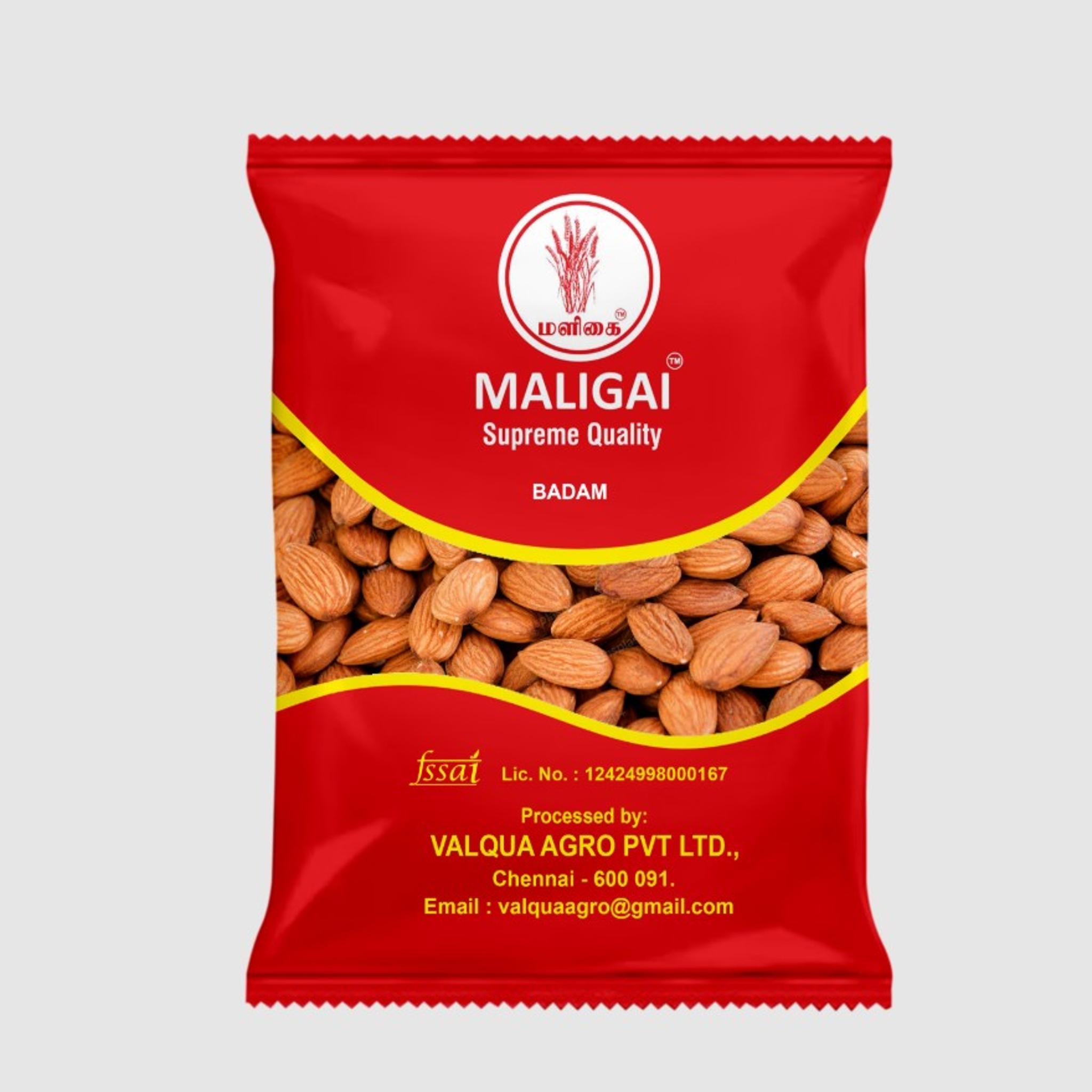 Maligai Badam, commonly known as almonds, are edible seeds from the fruit of the almond tree (Prunus dulcis). They are oval-shaped, light brown in color, and have a mildly sweet flavor. Almonds are highly nutritious and valued for their rich content of healthy fats, protein, fiber, vitamins, and minerals.